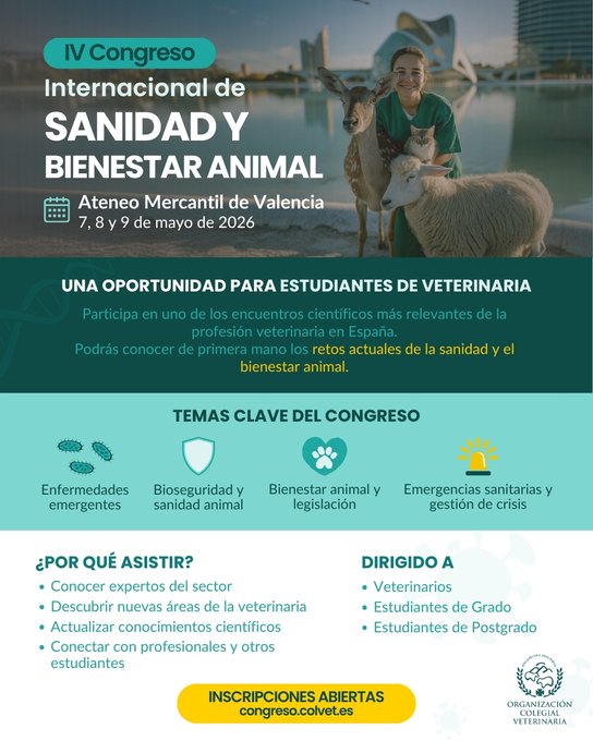 Valencia se convertirá en el epicentro del debate científico y profesional en torno a la sanidad y el bienestar animal con la celebración del IV Congreso Internacional de Sanidad y Bienestar Animal, organizado por la Organización Colegial Veterinaria y que tendrá lugar los días 7, 8 y 9 de mayo de 2026.