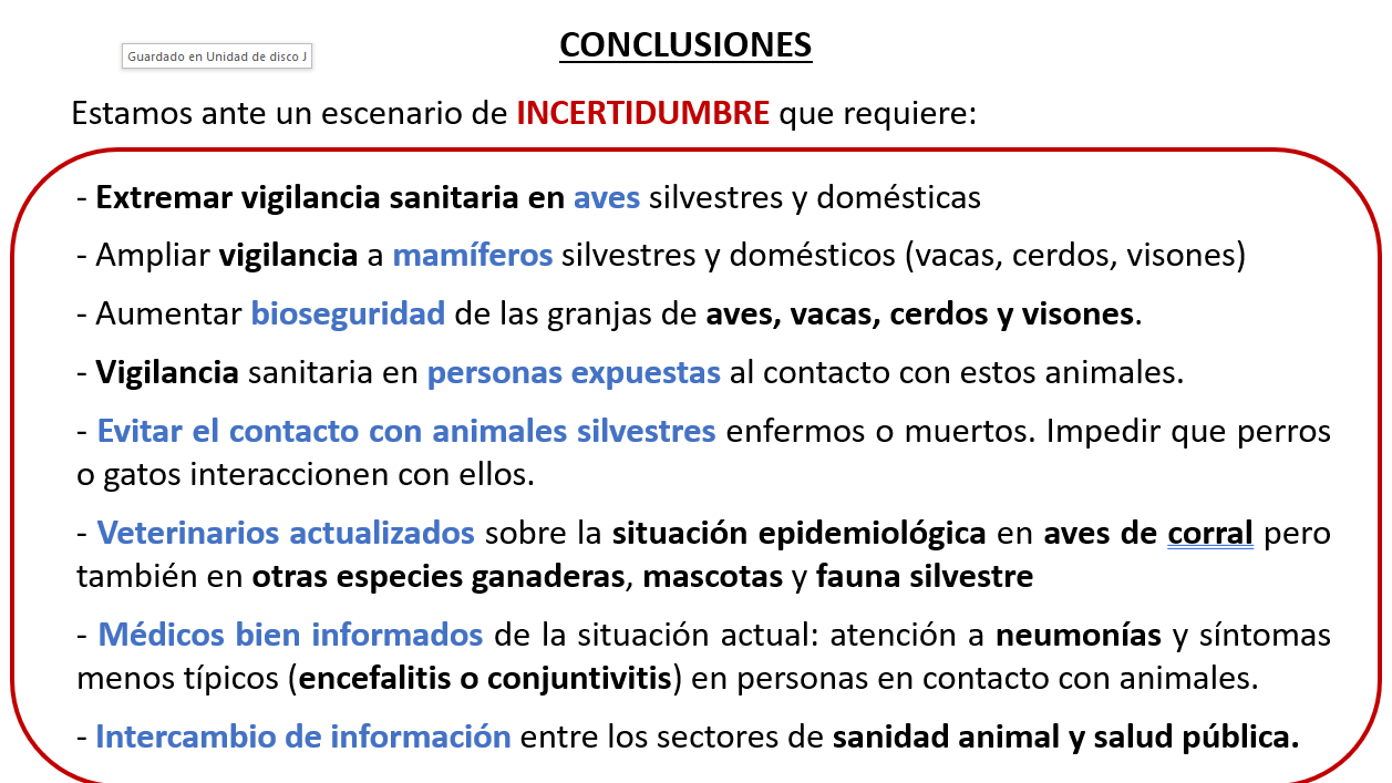 El incremento de los casos y de los movimientos de aves migratorias ha llevado al Ministerio de Agricultura, Pesca y Alimentación (MAPA) a activar la totalidad de las medidas de protección previstas en la Orden APA/2442/2006, de 27 de julio (más información COLVEMA: Jornada Gripe Aviar y Gripe Estacional para Veterinarios) CONCLUSIONES