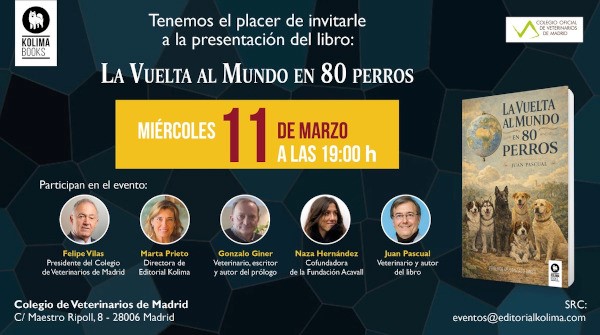 Editorial Kolima publica La vuelta al mundo en 80 perros, un libro escrito por el veterinario Juan Pascual en el que, a través de un recorrido por la historia, la geografía y la cultura, nos acerca las historias reales de 80 de estos animales que han acompañado al hombre prácticamente desde el inicio de la humanidad. La obra será presentada en la sede de COLVEMA el 11 de marzo, a las 19 horas.